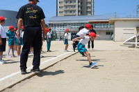 安全確認の方法や右折・左折の手信号、交通ルールなどについてお話を聞いたり、自転車に乗って練習をしたり、2時間の教室で子どもたちは、たくさんの体験をしました。信号や踏切、横断歩道など、運動場にたくさん準備していただいたおかげで、子どもたちも実際の道路を想定して練習をすることができました。「道路の左側に寄って運転してね。」、「交差点では左右の確認をしてね。」など、みなさんに具体的に声を掛けていただき、子どもたちは落ち着いて自転車を運転することができたようです。交通安全への意識もずいぶんと変わりました。