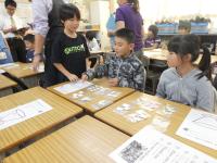 一人一人が順番に前に出て、自分が作った問題を紹介します。周りの子どもたちは、問題を聞いて「まる」と「ばつ」の札を選び、クイズに答えます。答えが合って、大喜びする子どもの姿が、1時間の中でたくさん見られました。